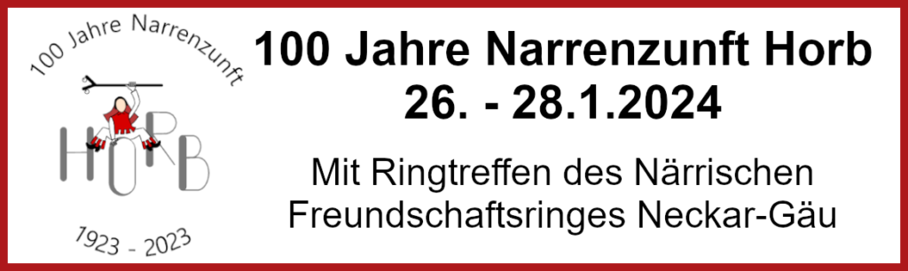 Die Narrenzunft Horb feiert vom 26. bis 28. Januar 2024 auf dem Horber Festplatz das 100 jährige Bestehen der Zunft mit einem großen Ringtreffen des Närrischen Freundschaftsrings Neckar-Gäu.