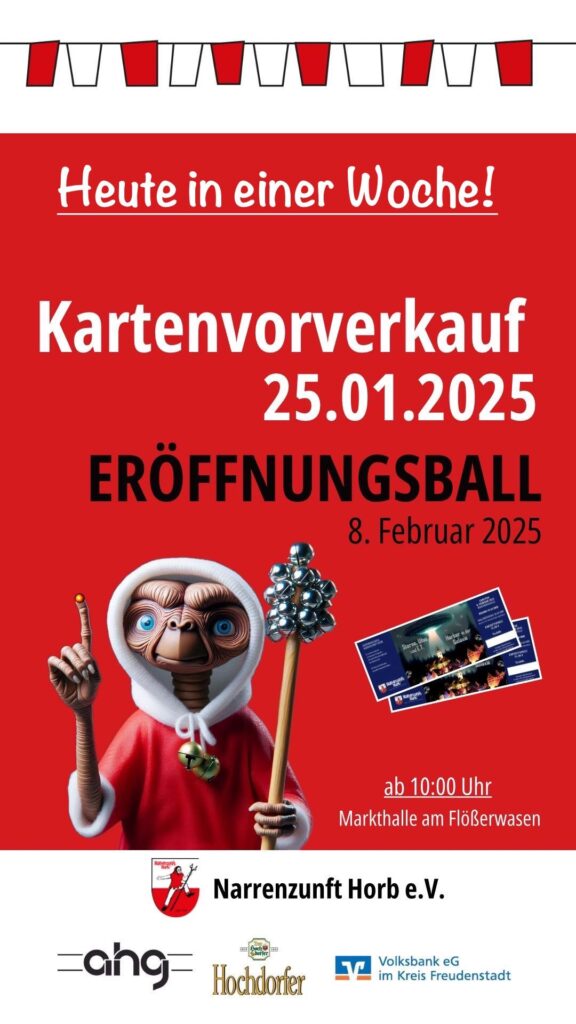 Der Kartenvorverkauf für dieses Ereignis startet am Samstag, 25.01.2025 ab 10:00 Uhr (bis 12 Uhr) in der Markthalle auf dem Flößerwasen in Horb.
