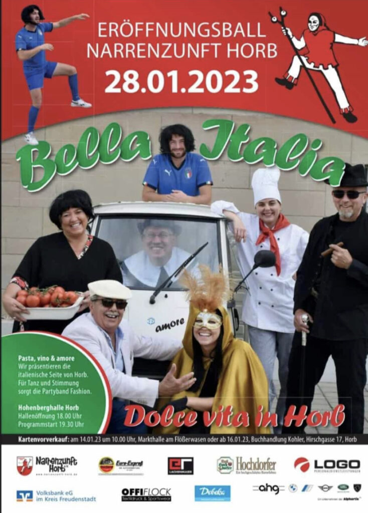 „Bella Italia – Dolce Vita in Horb“, so lautet das diesjährige, vielfältige Motto des Eröffnungsballes, zu welchem die Narrenzunft herzlich einlädt.