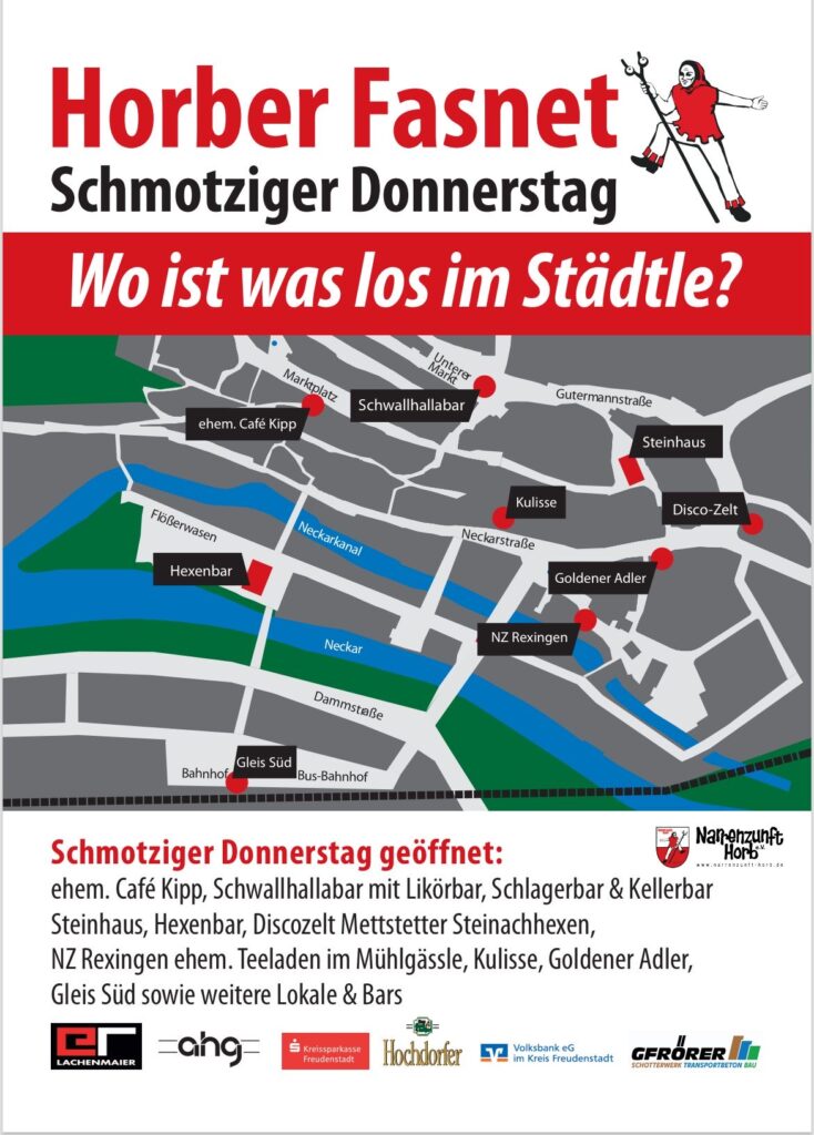 Die Bar der Mettstetter Steinachhexen bei der Weinhandlung Dörr, die Bar der Narrenzunft Rexingen im Mühlgässle und der Goldene Adler in der Neckarstraße sind weitere tolle Möglichkeiten den Schmotzigen Donnerstag in Horb zu verbringen.