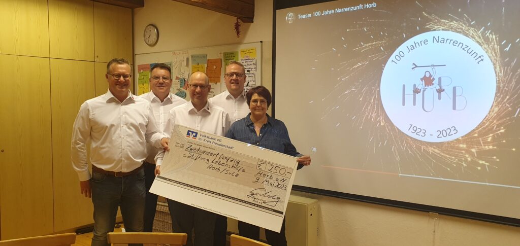 Der Stv. Vorsitzenden Barbara Rauschenberger konnte ein Betrag in Höhe von 250 € durch die Zunftmeister Gerd Munding, Alexander Guth, Christoph Baiker und Christian Bok übergeben werden. Das Geld stammt zu einem aus den Spenden der Gastzünfte am Horber Umzug und zum anderen verzichtet die Horber Zunft auf Gastgeschenke bei auswärtigen Umzügen.